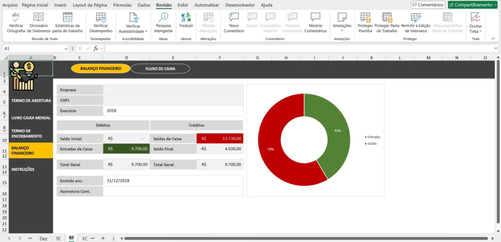 A planilha inclui modelos pré-formatados de termo de abertura e termo de encerramento. Basta preencher os campos com as informações da empresa e o período de análise, economizando tempo e garantindo conformidade com as normas contábeis.