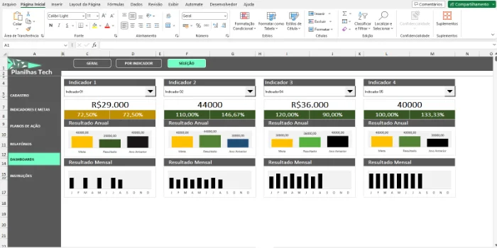 A Planilha para Controle de Metas e Indicadores em Excel é composta por diversas abas que abrangem todos os aspectos do acompanhamento de metas e indicadores: