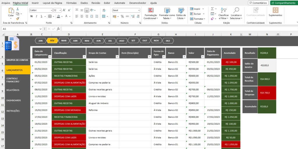 A planilha gera gráficos automáticos de gastos e receitas. Utilize esses recursos para enxergar onde os gastos estão crescendo mês a mês.