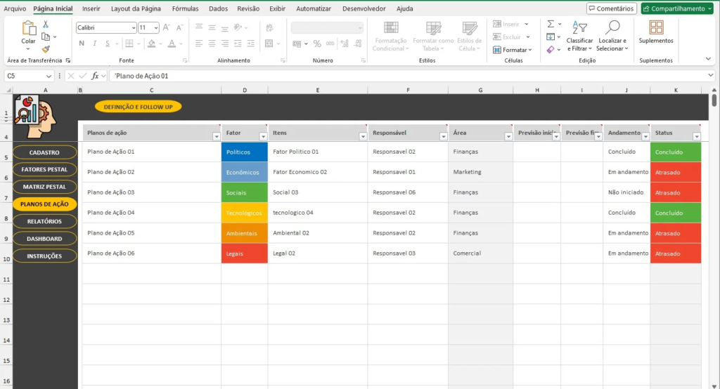 - Fatores PESTAL: Informações detalhadas sobre cada fator político, econômico, social, tecnológico, ambiental e legal.