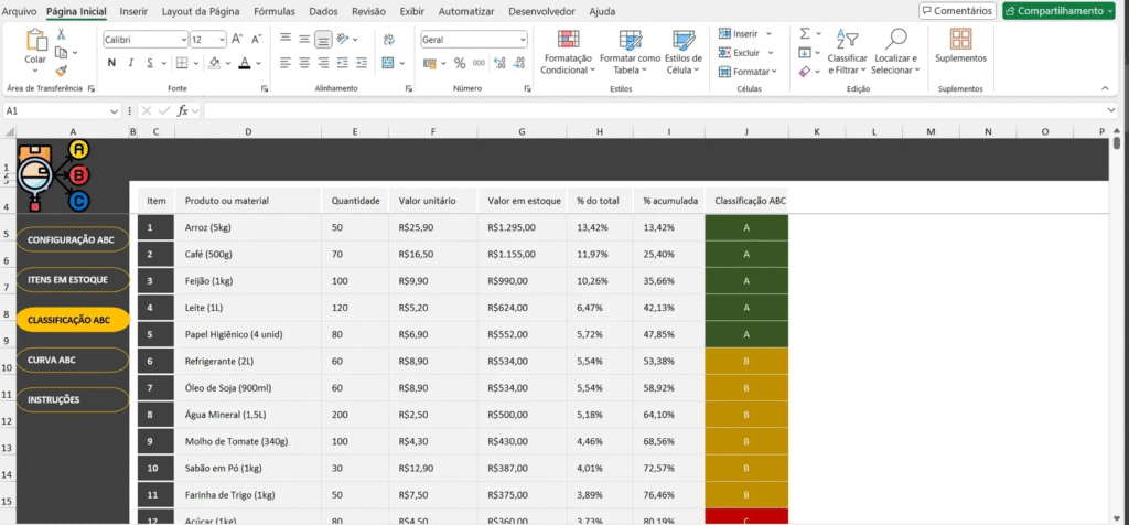 Imagine que sua empresa possui 20 produtos acabados. Ao inserir dados como valor de venda e potencial de vendas em uma planilha, você pode rapidamente visualizar quais produtos devem ser classificados nas categorias A, B e C. Este tipo de análise permite ajustes estratégicos no estoque, garantindo que os produtos mais valiosos estejam sempre disponíveis.