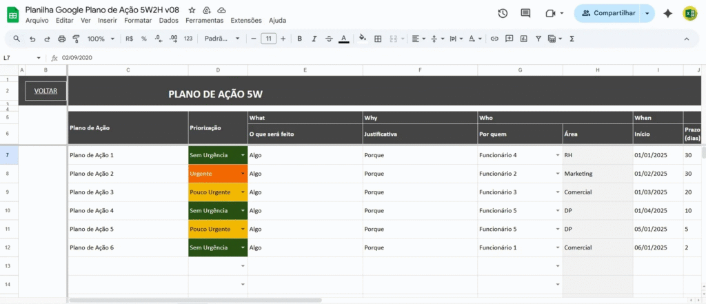 A 5W2H Google Sheets Plano Ação é projetada para mitigar esses problemas, proporcionando uma estrutura clara e eficiente para o planejamento e execução de ações.