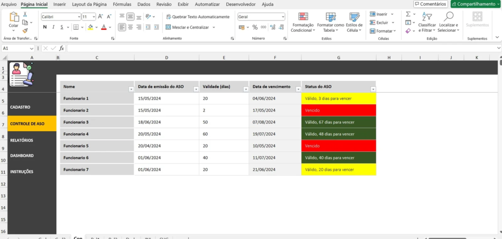 Para cada funcionário, registre a data de emissão do ASO e sua validade. A planilha calcula automaticamente a data de vencimento, permitindo o monitoramento do status de cada atestado.