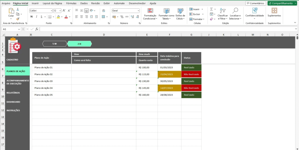 Automatizar processos dentro das planilhas não apenas reduz o erro humano, mas também libera a equipe para se concentrar em tarefas mais estratégicas que impulsionam o crescimento do negócio. Aqui estão algumas formas de automação em uma Planilha Plano de Ação 5W2H: