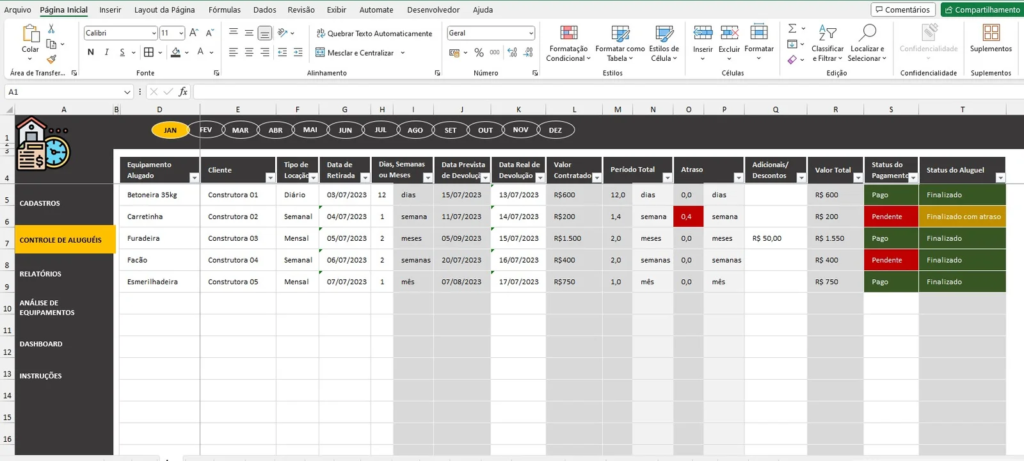 Aproveite os filtros da planilha para visualizar rapidamente informações específicas, como locações em aberto ou equipamentos disponíveis.