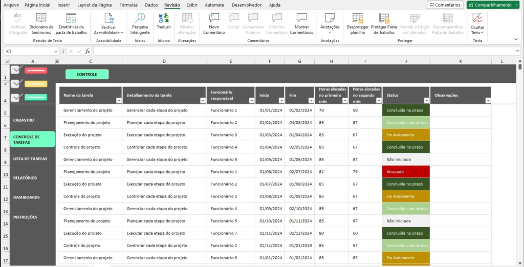 - Acompanhamento Diário: Utilize a planilha diariamente para atualizar o status das tarefas, verificar o cumprimento dos prazos e realocar recursos conforme necessário.