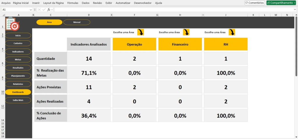 - Registro de Resultados: Permite inserir dados periodicamente para acompanhar o desempenho em relação às metas estabelecidas.