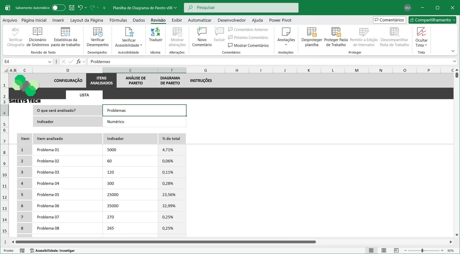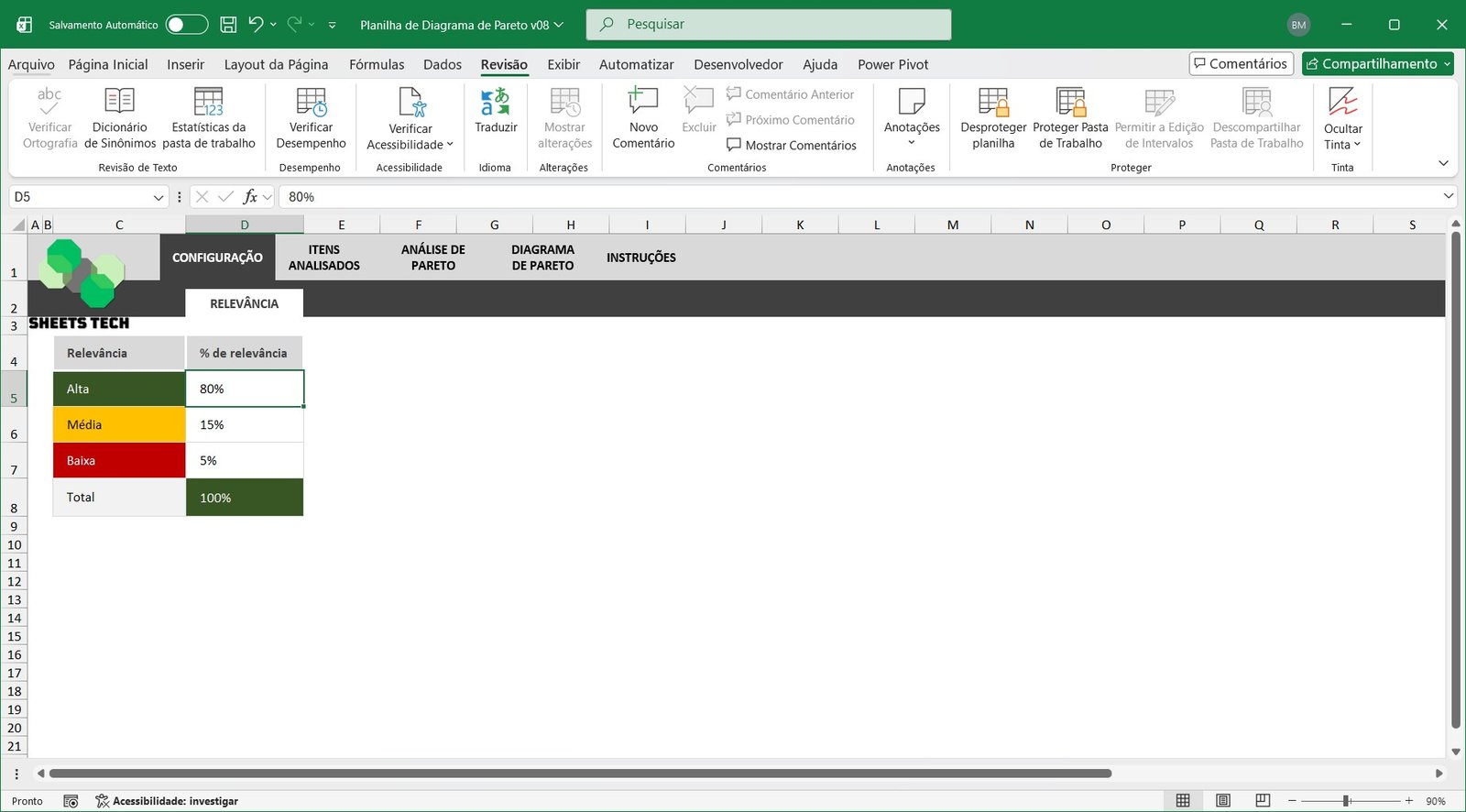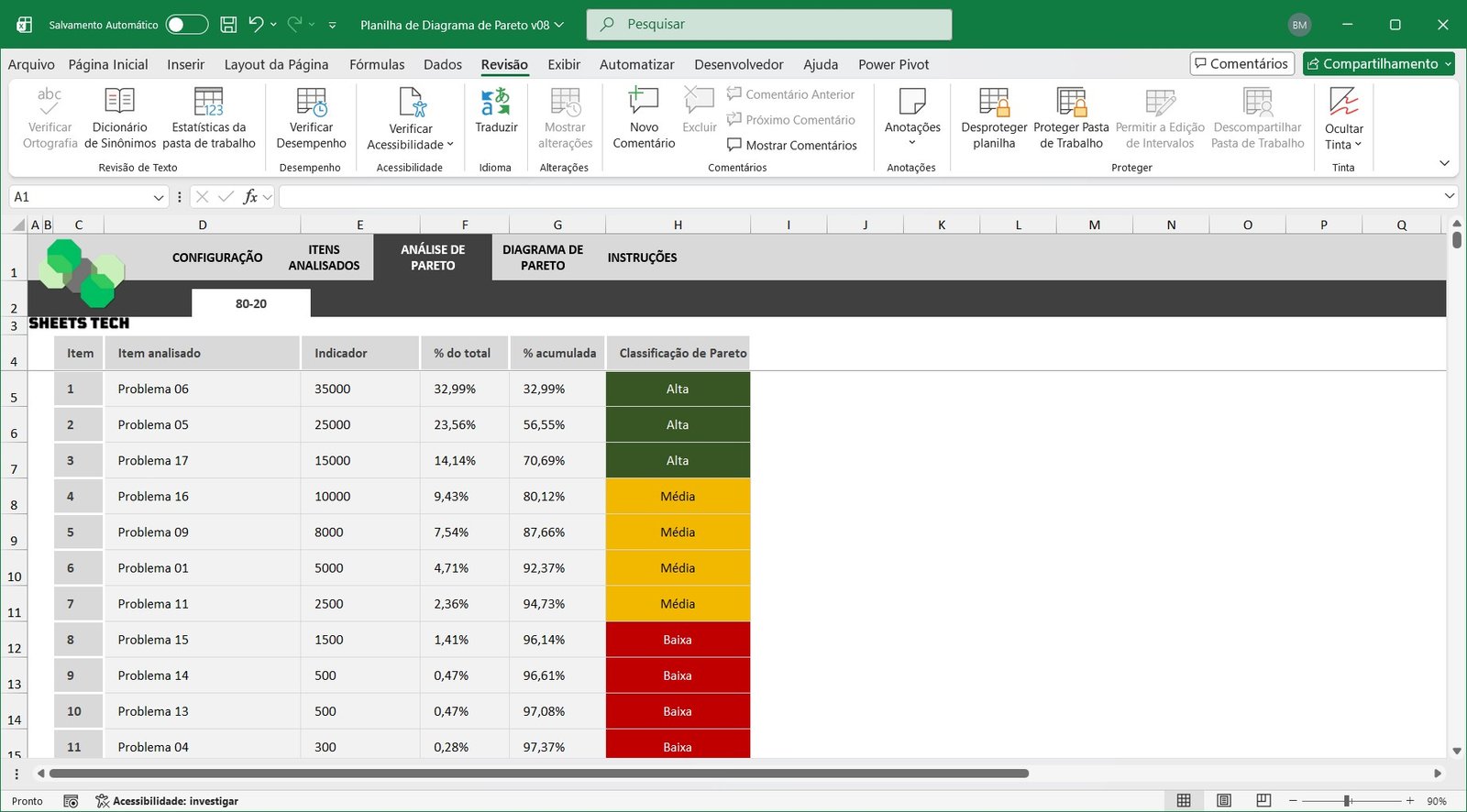 Planilha de Diagrama de Pareto (80/20) em Excel