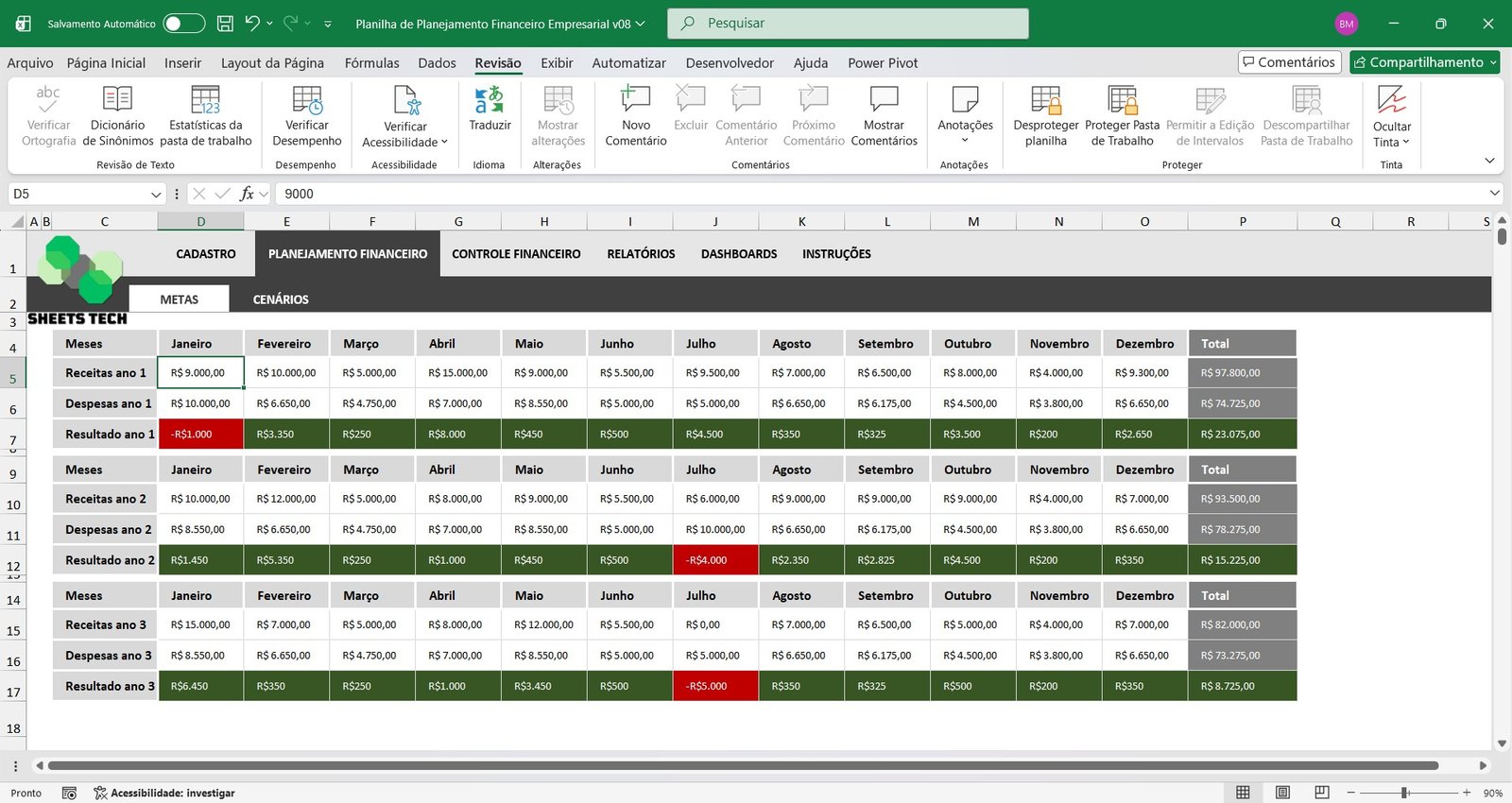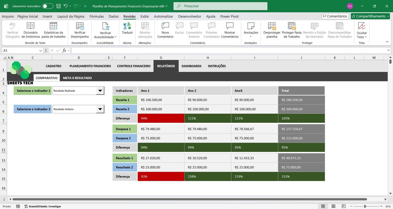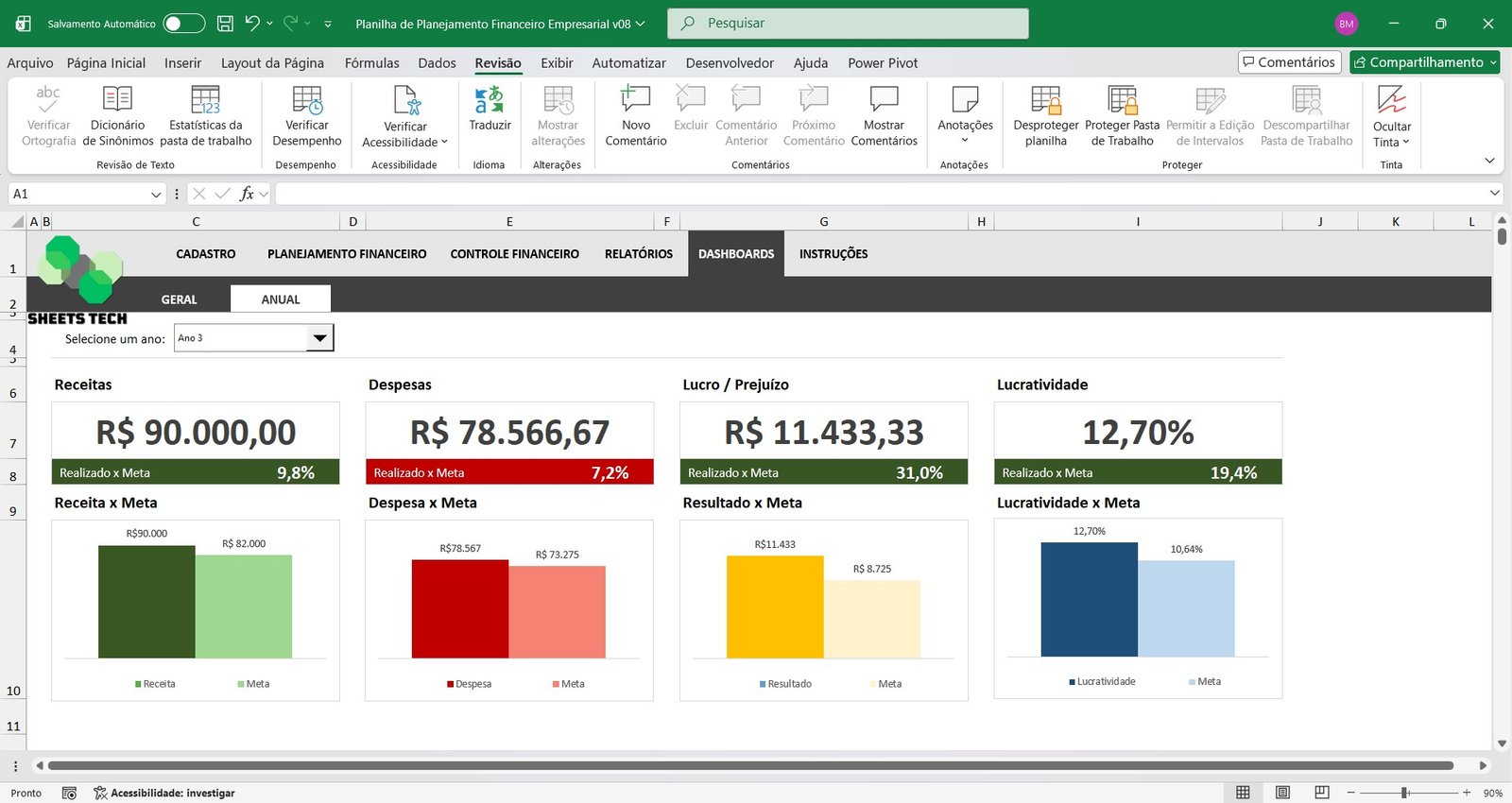 A planilha calcula automaticamente o resultado e compara com as metas definidas, permitindo acompanhar a evolução do seu negócio ao longo dos 3 anos.