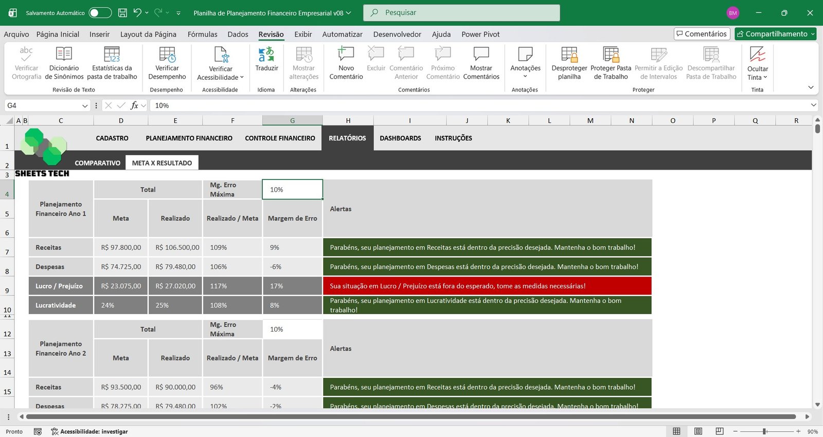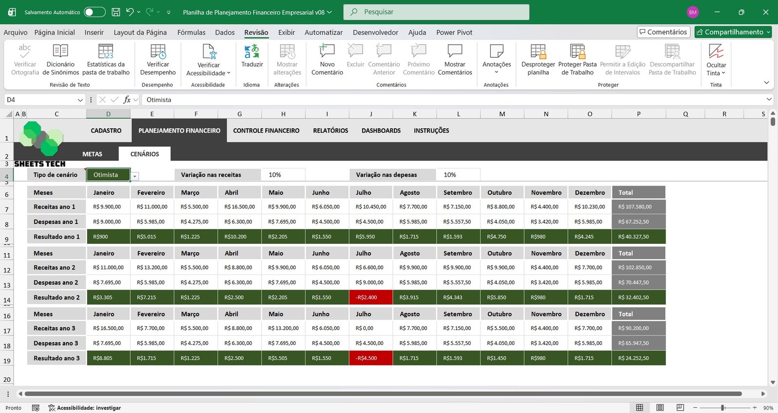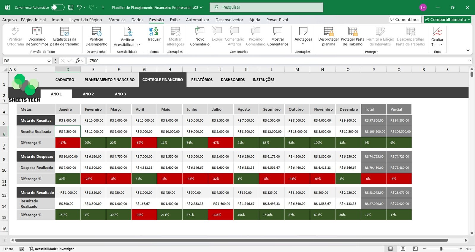 A planilha calcula automaticamente o resultado e compara com as metas definidas, permitindo acompanhar a evolução do seu negócio ao longo dos 3 anos.