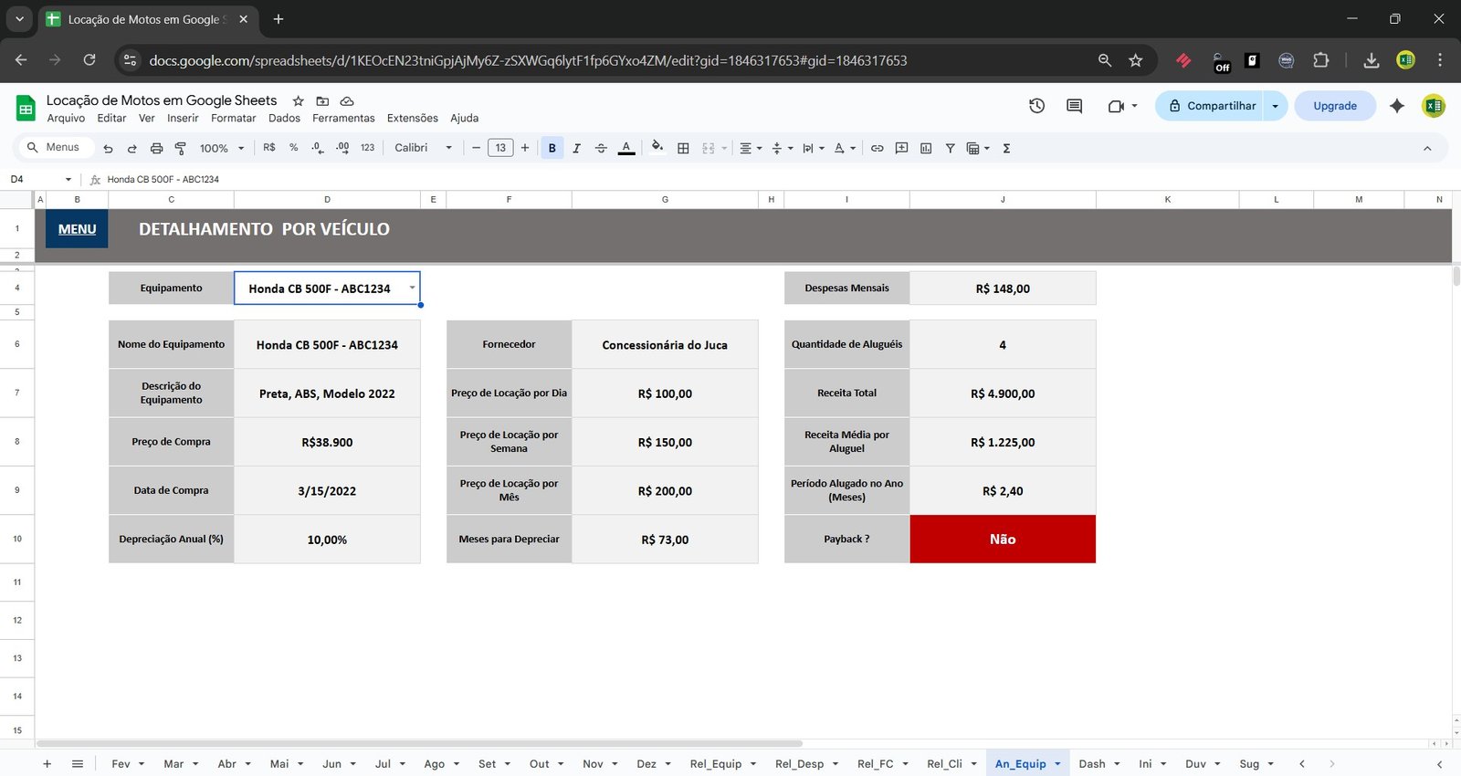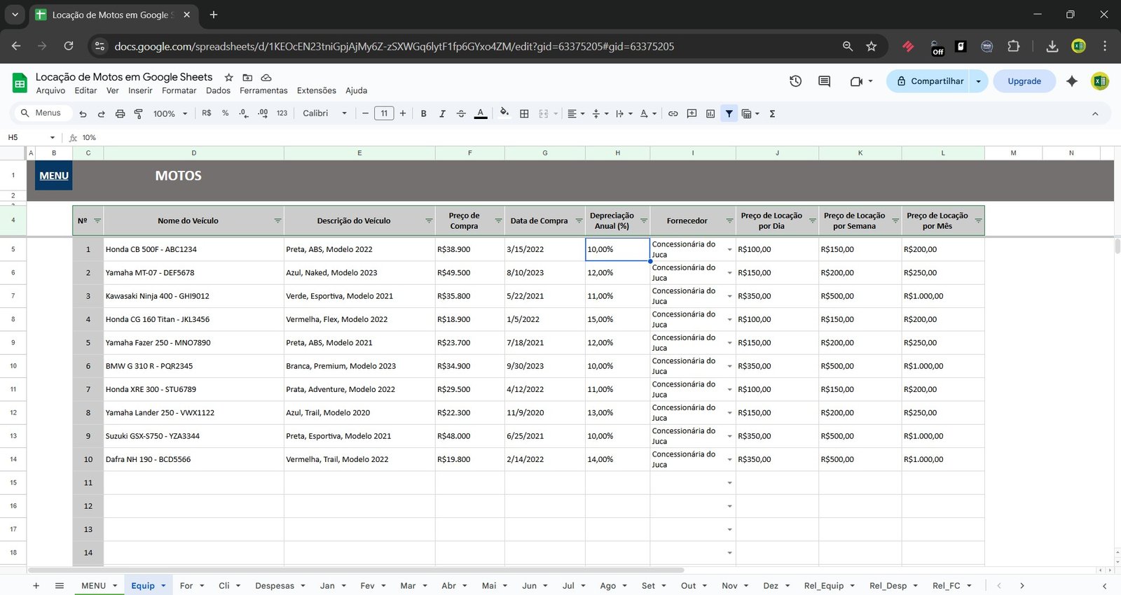 Por ser uma Planilha Google para locação de motos, você pode: