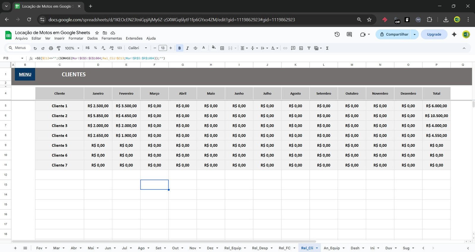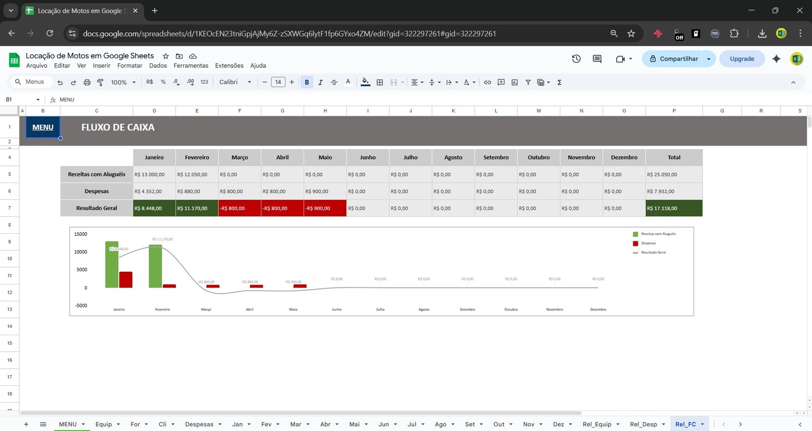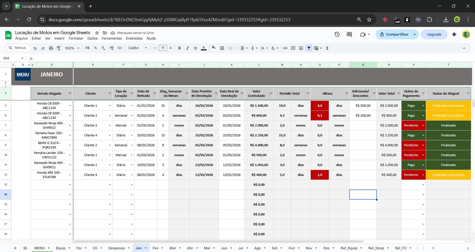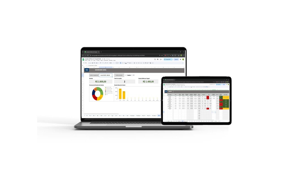 Desenvolvida no Google Sheets, permite controlar cadastro de motos, clientes, despesas, contratos de locação, atrasos, pagamentos e resultados financeiros em um único lugar.