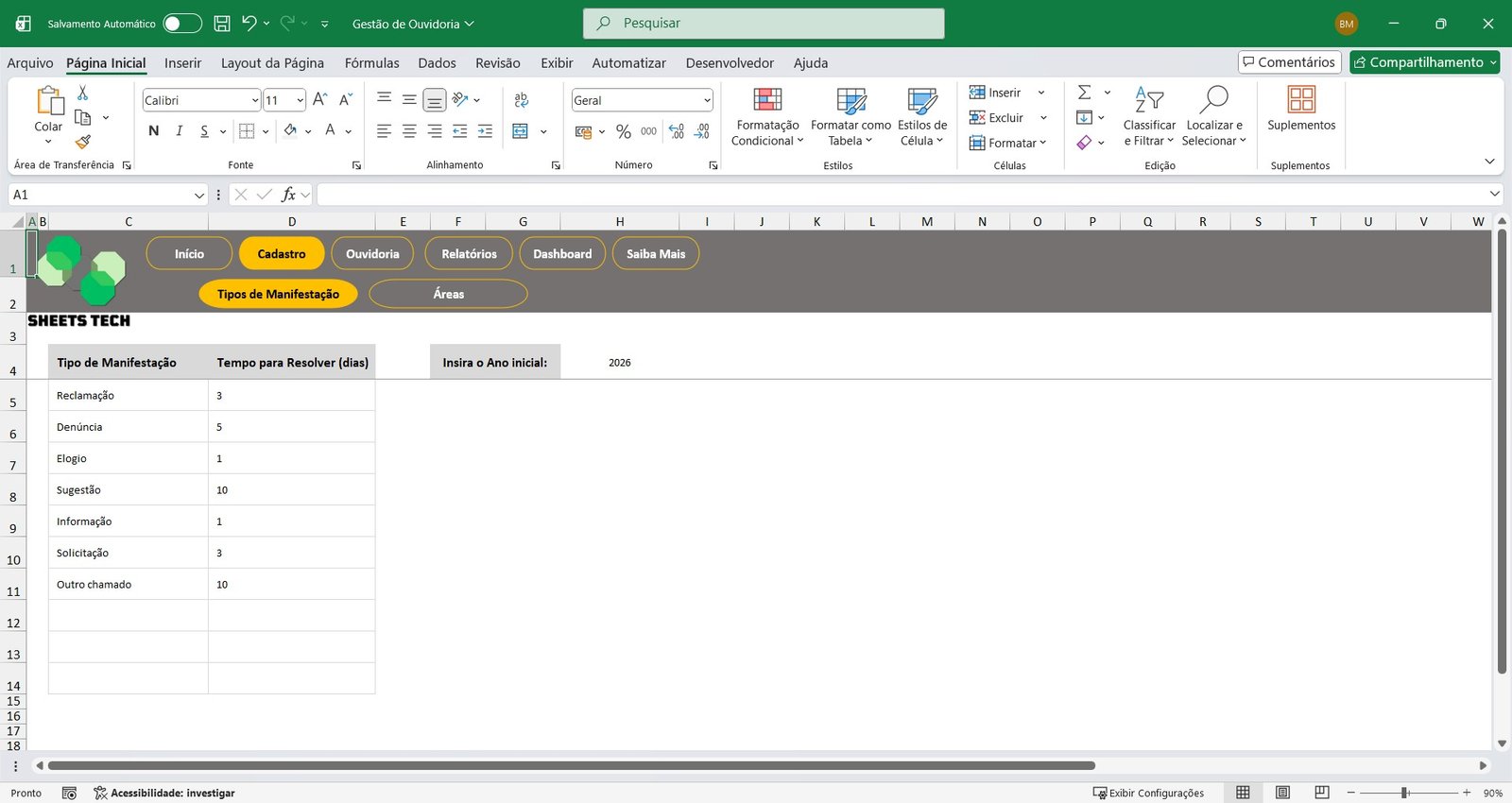 Defina também o prazo de resolução (em dias) para cada tipo. A planilha utiliza essa informação para controlar automaticamente os vencimentos.