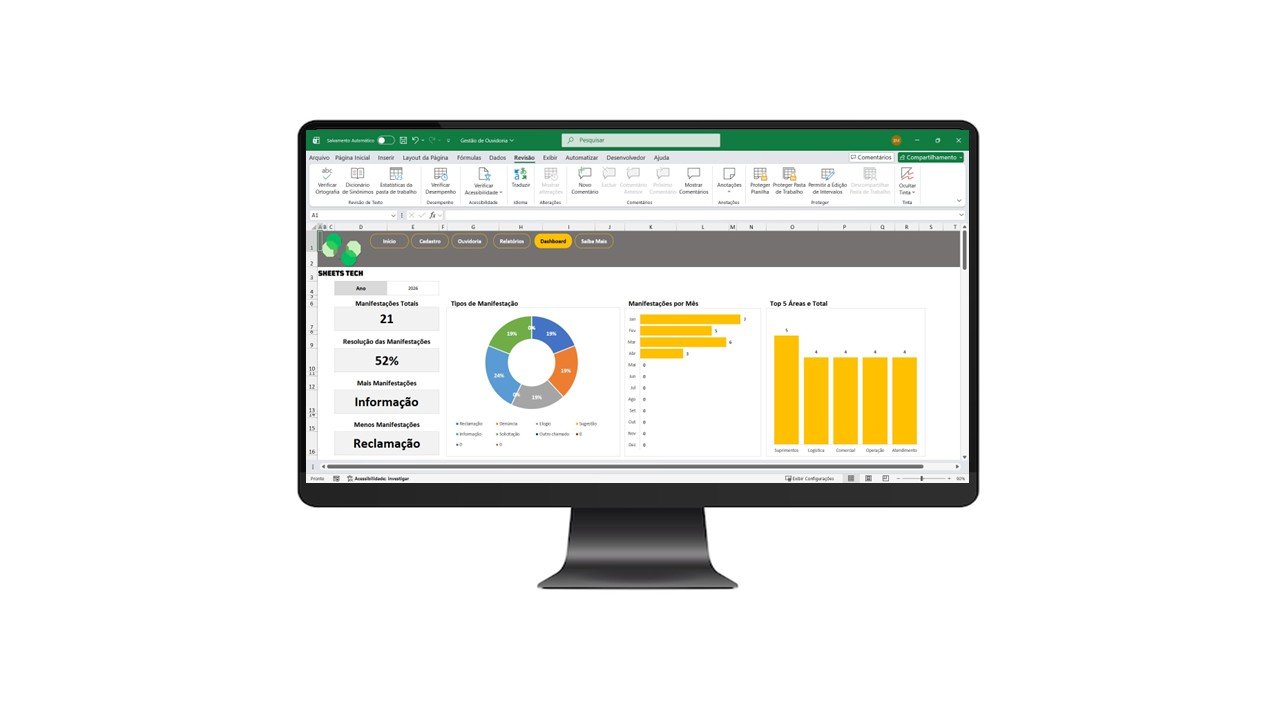 A Planilha de Gestão de Ouvidoria foi desenvolvida para empresas que precisam registrar, acompanhar e analisar manifestações, garantindo controle de prazos, transparência e tomada de decisão baseada em dados.