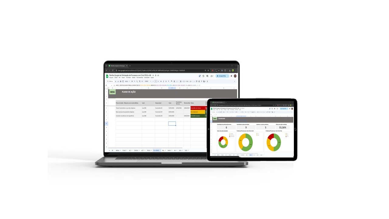 Gerencie problemas, processos e planos de ação de forma simples, visual e totalmente automática com a Planilha PDCA no Google Sheets.