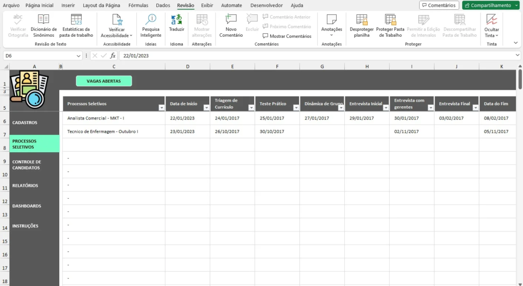 Manter um registro atualizado das vagas em aberto é acima de tudo essencial para atrair os candidatos certos. Com uma planilha Excel, você pode criar uma aba para cada vaga disponível na empresa, incluindo informações como cargo, requisitos, responsabilidades e benefícios. Isso facilita a divulgação das vagas e atrai candidatos que se encaixam no perfil desejado.